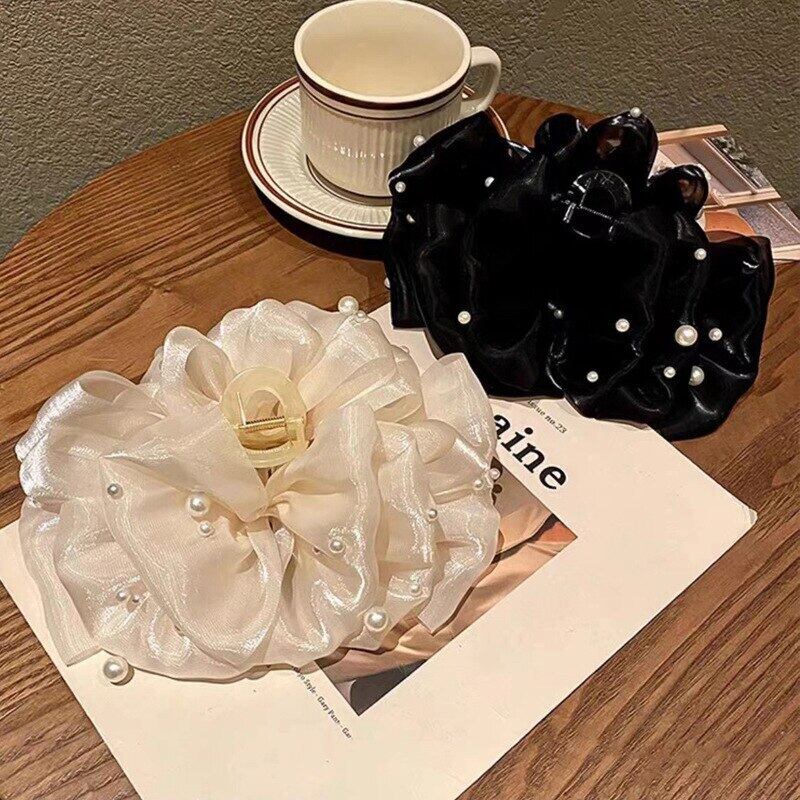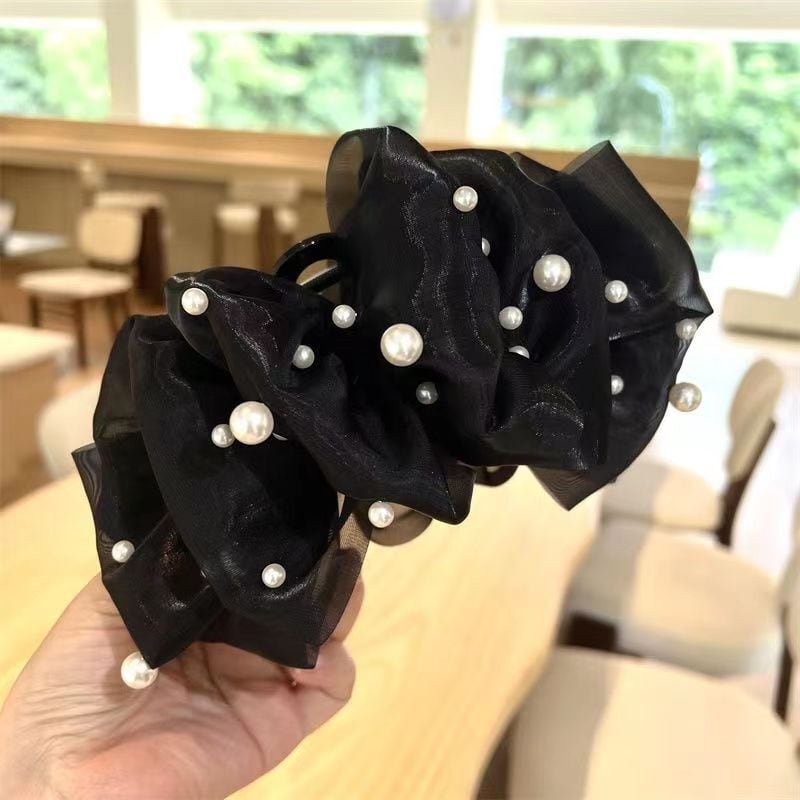 バブルメッシュ弓パールグラブクリップ特大多層ポニーテールサメクリップ高級ヘアアクセサリー リボン マルチレイヤー 真珠